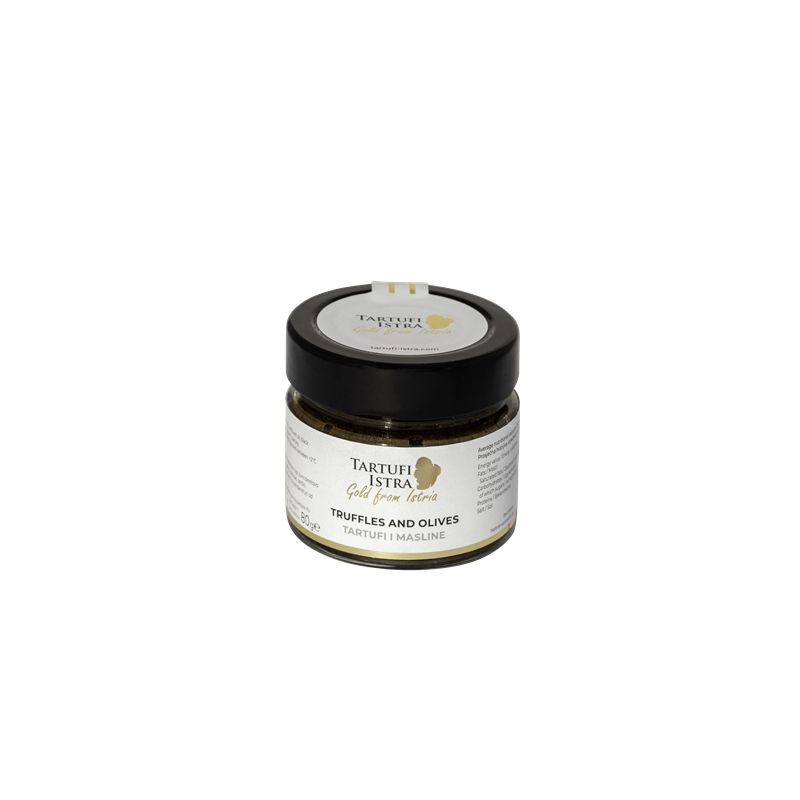 Sestavine: črne olive 74%, ekstra deviško oljčno olje, sončnično olje, črni tartuf (Tuber aestivum Vitt.) 4%, sol, česnik, peteršilj.