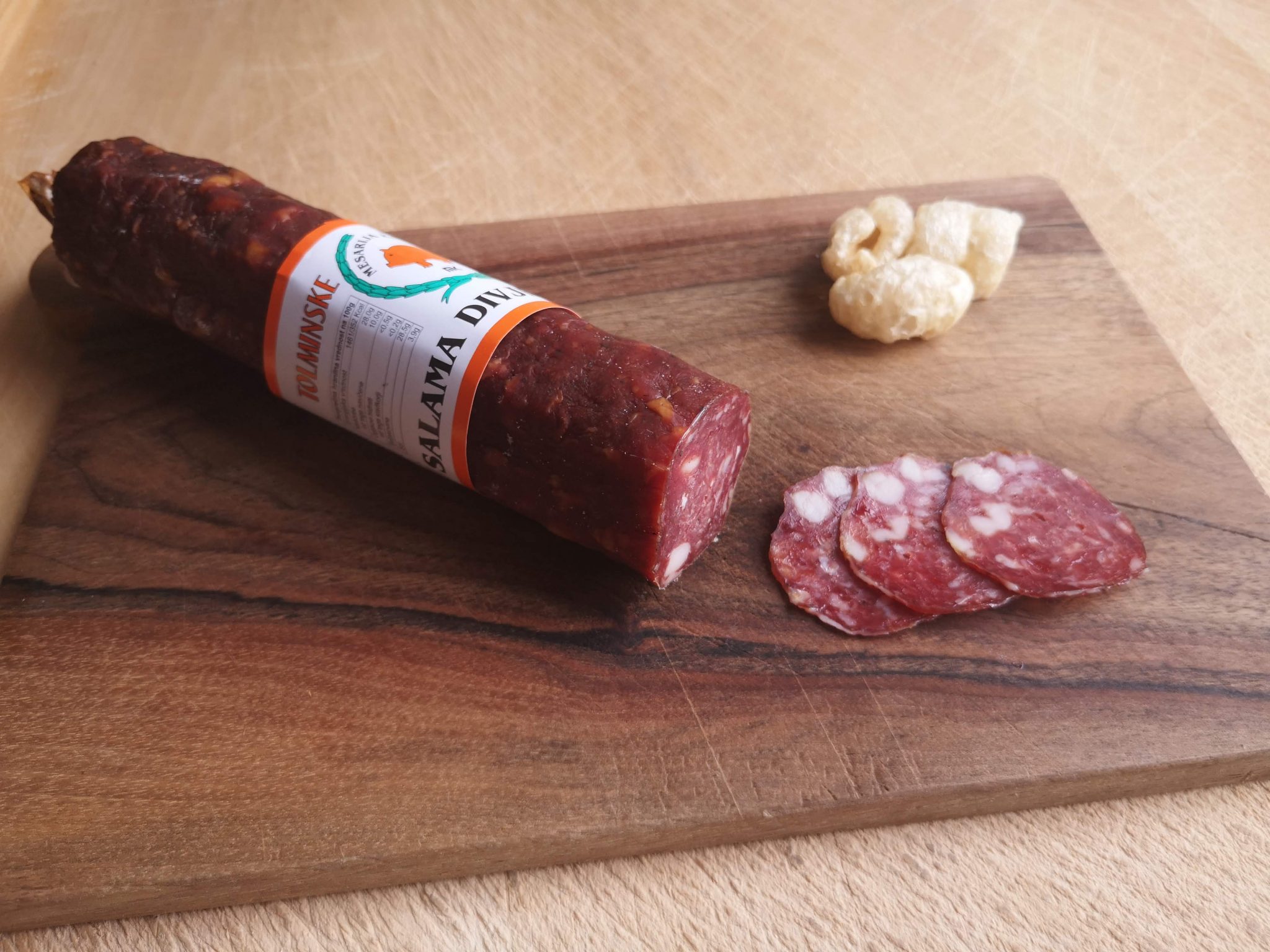 Samo izbrano prvo kakovostno svinjsko meso in meso divjega prašiča. Salama je prekajena, kar okus in aromo samo še povzdigne. Salama divjega prašiča sodi v vrh kulinaričnih mesnih dobrot. Brez glutena.