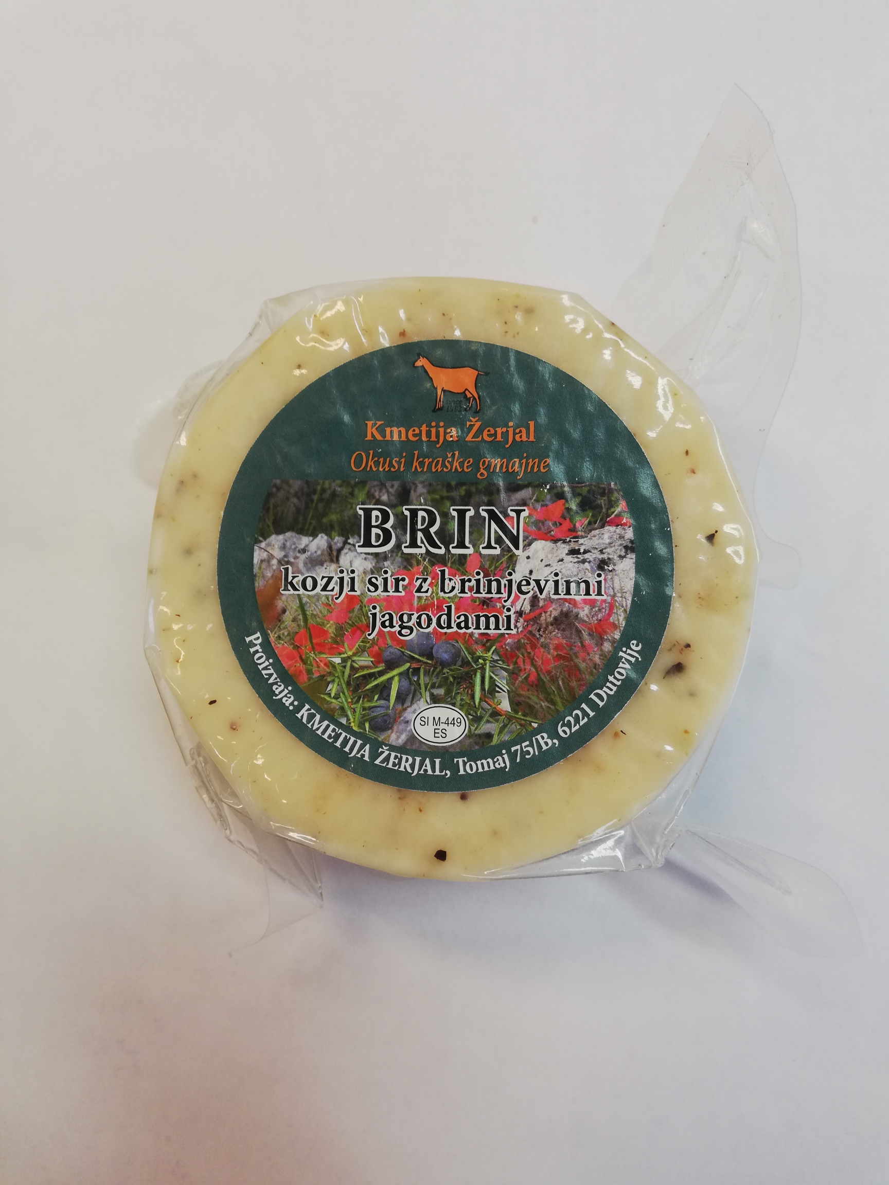Poltrdi, zorjen kozji sir iz surovega kozjega mleka z dodanimi brinovimi jagodami.